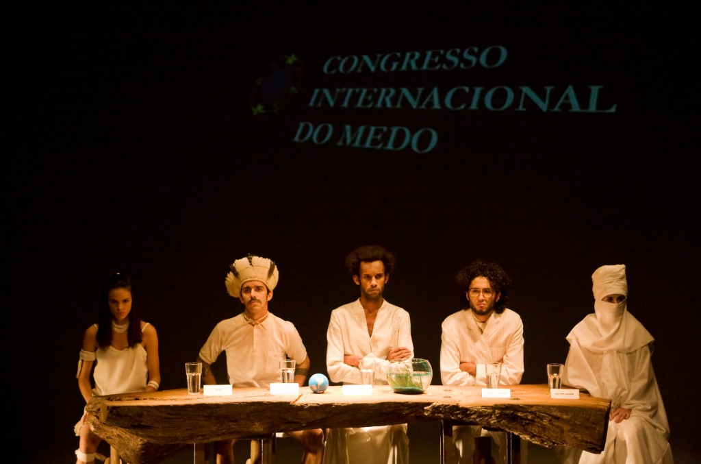 Congresso Internacional do Medo – que estreou em 2008 – deu início à programação do ACTO2 com duas apresentações, nos dias 20 e 21 de outubro, realizadas no Galpão Cine Horto – palco que de certo modo deu origem às atividades do grupo, anos atrás, quando da criação da cena que resultou no espetáculo Por Elise. O Congresso do título reúne representantes de países imaginários, que falam línguas diferentes, para discutir questões em comum a todos. A trama oferece um paralelo possível com o próprio ACTO: cada grupo vem de um lugar diferente do Brasil e cada um fala uma língua – a linguagem dos seus espetáculos são bem diferentes. Mas a comunicação se mostra não apenas possível mas bastante produtiva entre esses palestrantes – assim como acontece entre os grupos. Na peça, no entanto, a dificuldade de comunicação entre os falantes de línguas diversas é num primeiro momento um sinal de incomunicabilidade.